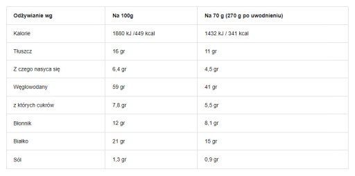 Wartości odżywcze na 100 g / porcja 70 g (270 g po uwodnieniu)