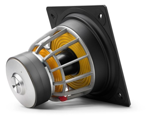 Ekstremalna głębokość montażu przetwornika E-Sub jest bardzo celowa. Pozwala na powstanie szerokich szczelin między trzema elementami zawieszenia (gumową ramą i podwójnymi pająkami), zapewniając wyjątkową stabilność mechaniczną w pełnym zakresie wychylenia przetwornika. To jeszcze bardziej poprawia liniowość, zmniejsza zniekształcenia i zwiększa długoterminową niezawodność. W stylu inżynieryjnej elegancji stalowy przedni kołnierz montażowy E-Sub tworzy całą przednią przegrodę gotowego produktu, podczas gdy tylna płyta przetwornika jest gwintowana i przykręcana do tylnej ściany obudowy w celu podparcia.