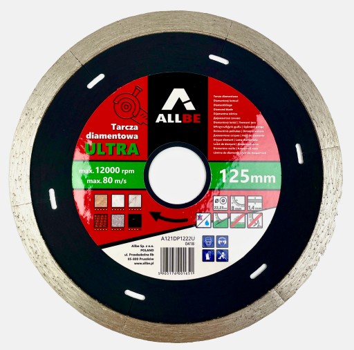 Tarcze diamentowe ALLBE przeznaczone są dla najbardziej wymagających użytkowników, profesjonalistów. W tarczy zastosowano segment diamentowy najwyższej jakości, który laserowo nacięcio dzięki czemu tarcza nie przegrzewa się oraz jest bardzo stabilna. Bardzo niska grubość tarczy 1,4 mm zapewni precyje cięcia a bardzo drobne ziarno diamentu zapewni pracę bez uszczerbień na płytkach.