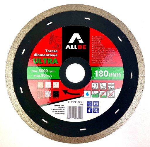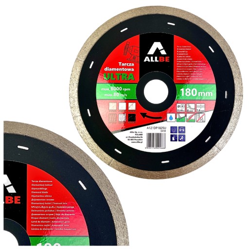 Tarcze diamentowe ALLBE przeznaczone są dla najbardziej wymagających użytkowników, profesjonalistów. W tarczy zastosowano segment diamentowy najwyższej jakości, który laserowo nacięcio dzięki czemu tarcza nie przegrzewa się oraz jest bardzo stabilna. Bardzo niska grubość tarczy 1,6 mm zapewni precyje cięcia a bardzo drobne ziarno diamentu zapewni pracę bez uszczerbień na płytkach.