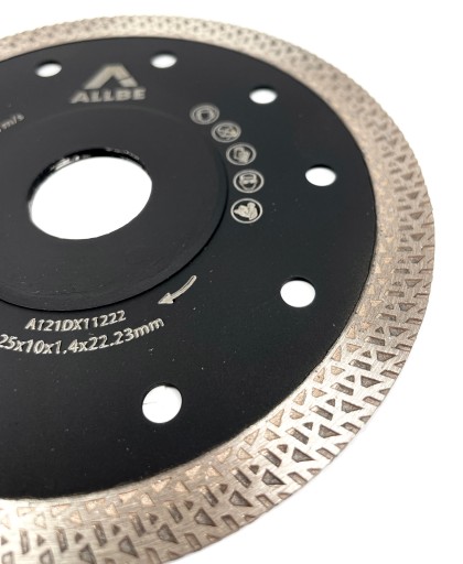Tarcze diamentowe ALLBE przeznaczone są dla najbardziej wymagających użytkowników, profesjonalistów. W tarczy zastosowano specjalny wieńcowy segment diamentowy najwyższej jakości, który podczas cięcia ma także szlifować boki. Bardzo niska grubość tarczy 1,4 mm zapewni precyje cięcia a bardzo drobne ziarno diamentu pracę bez uszczerbień na płytkach. Segment wysokości 10 mm wydłuży czas użytkowania oraz możliwość pracy na grubszych płytkach.