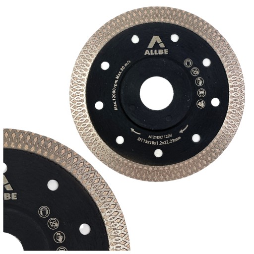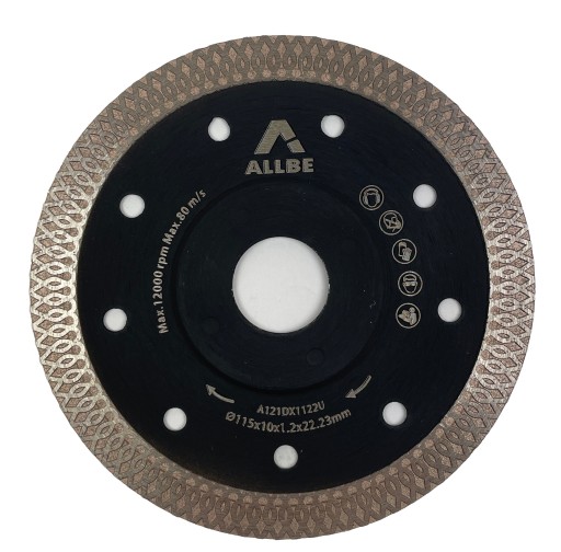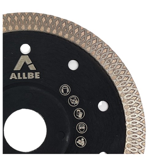 Tarcze diamentowe ALLBE przeznaczone są dla najbardziej wymagających użytkowników, profesjonalistów. W tarczy zastosowano specjalny wieńcowy segment diamentowy najwyższej jakości, który podczas cięcia ma także szlifować boki. Bardzo niska grubość tarczy 1,2 mm zapewni precyje cięcia a bardzo drobne ziarno diamentu pracę bez uszczerbień na płytkach. Segment wysokości 10 mm wydłuży czas użytkowania oraz możliwość pracy na grubszych płytkach.