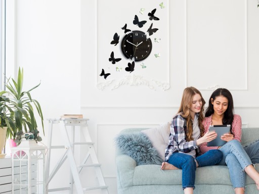 Montaż zegara jest szybki i wygodny. Tarcza ze wskazówkami jest do zawieszenia na haczyk. Motylki są samoprzylepne i montuje się do ściany za pomocą taśmy montażowej. Każdy element jest gotowy do montażu.