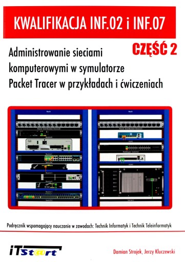 Książka "Kwalifikacja: INF.02 i INF.07 - Administrowanie sieciami komputerowymi w symulatorze Packet Tracer w przykładach i ćwiczeniach Część II" jest podręcznikiem wspomagającym nauczanie w zawodach: Technik Informatyk i Technik Teleinformatyk. Jest kontynuacją pierwszej części książki o tym samym tytule. Może być wykorzystywana na przedmiotach poruszających zagadnienia projektowania, zarządzania i administrowania sieciami komputerowymi obejmującymi zagadnienia: podstawy konfigurowania następujących protokołów, usług i technik sieciowych: routing dynamiczny RIP, EIGRP, OSPF, eBGP, routing statyczny, listy kontroli dostępu, VoIP, STP, RSTP, VTP, FRAME RELAY, PPP, uwierzytelnianie PAP i CHAP, RADIUS, NETFLOW, NAT, L2NAT, VPN, tunelowanie, przełączniki wielowarstwowe 3560-24PS i 3650-24PS. Zawiera ćwiczenia praktyczne oraz wskazówki do rozwiązań zadań w postaci plików do samodzielnego pobrania. Zasada przyjęta przez autorów książki była następująca "Minimum teorii - maksimum przykładów praktycznych", które można wdrożyć zarówno w środowisku symulacyjnym podczas zajęć lekcyjnych jako rozszerzenie teorii oraz w formie zadań domowych, których wykonanie możemy zlecić uczniom. Ponadto dysponując sprzętem i laboratorium sieciowym, swobodnie możemy scenariusze ćwiczeń i przykładów wykorzystać do konfiguracji fizycznego sprzętu. Autorzy tej książki to zespół międzypokoleniowy i interdyscyplinarny. Utalentowany uczeń Zespołu Szkół Łączności w Gdańsku, Damian Strojek. Jego pasją są sieci komputerowe, posiada certyfikaty CCNA R&S oraz CCNA Security. Jerzy Kluczewski, długoletni instruktor Akademii CISCO CCNA. W swoim dorobku autorskim posiada już kilka publikacji książkowych na temat symulatora Packet Tracer. Swoje doświadczenie zdobywał podczas pracy w przemyśle, obecnie jest wykładowcą w Wyższej Szkole Bankowej w Gdańsku.