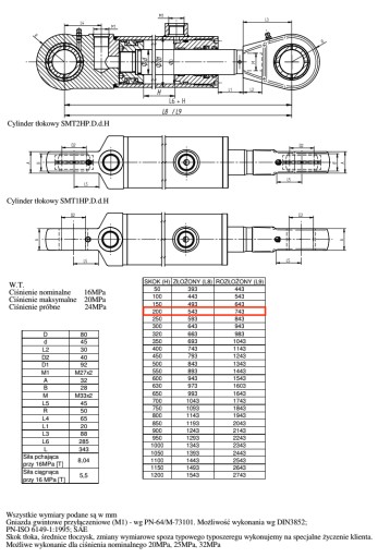 - Średnica tłoczyska (pręta) d – 45 mm