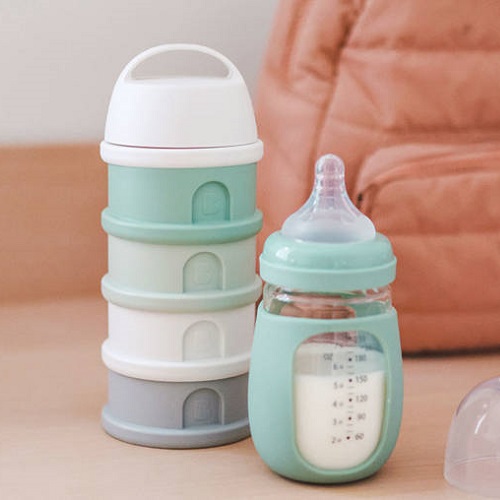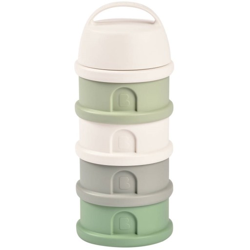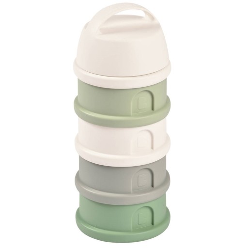 Kompaktowy zestaw 4 pojemników do przechowywania mleka w proszku francuskiej marki BEABA. Pojemniki (szałwiowy, kremowy, jasnoszary oraz pastelowo zielony) mają pojemność w sumie 440 ml (4x110ml). Zestaw idealny do zabrania mleka w proszku na spacer, podczas podróży czy na nocne karmienia. Każda komora mieści do 11 dawek mleka w proszku. Można w nim odmierzyć porcje nawet na dobę do przodu. Pojemniczki są na tyle szerokie, że łatwo się je napełnia i czyści. Nakręca się je jeden na drugi, ale można ich także używać osobno, w zależności od potrzeb. Dodatkowa nakrętka z wąskim otworem/lejkiem ułatwia przesypanie mleka do butelki. Pokrywka jest hermetyczna oraz ma wygodny uchwyt do przenoszenia. Pojemniki z czasem mogą również służyć jako poręczne pudełka na przekąski.