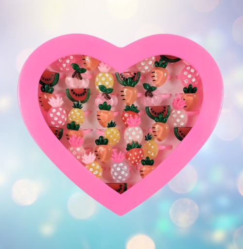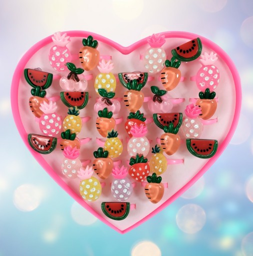 - 36 pierścionków z błyszczącymi elementami umieszczono w pudełeczku w kształcie serca.