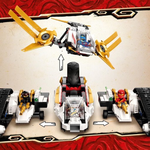- Dzieci mogą pilotować ekscytujący samolot odrzutowy ze sprężynowymi działkami lub prowadzić motocykl i dwa pojazdy terenowe. W każdym z czterech pojazdów mieści się minifigurka ninja.