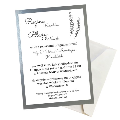 Zaproszenie jest wykonane na białym satynowym papierze i podklejone na papierze SREBRNE LUSTRO