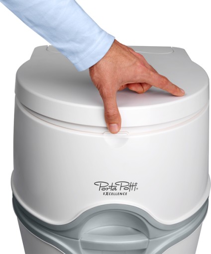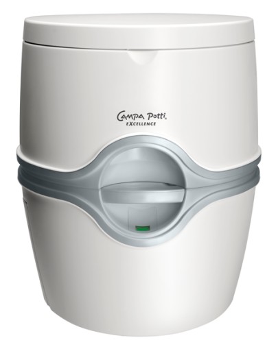 Przenośna toaleta turystyczna Excellence, wyposażona w elektryczną pompkę do spłukiwania, wskaźniki poziomu wypełnienia zbiornika na nieczystości oraz spłuczki.