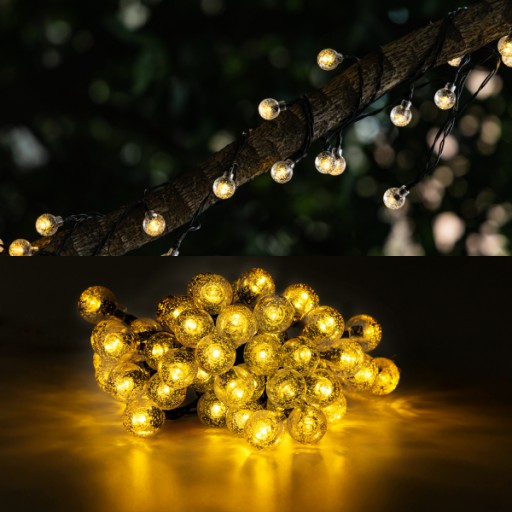 50 małych kulek perełek o średnicy 1,5 cm zapewni nastrojowe oświetlenie. Dzięki zasilaniu solarnemu nie zapłacisz nic za prąd, a dzięki czujnikowi zmierzchu lampki się automatycznie włączały po zmierzchu. Długi przewód zasilający pozwala na umieszczenie lampek w sporej odległości od solara, co jest przydatne w wypadku montażu pod dachem np. na patio. Kulki białe mleczne.