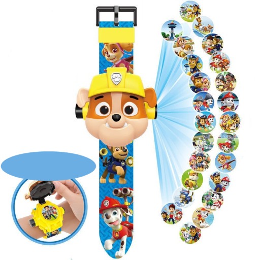 Niesamowity zegarek dla dzieci, który posiada projektor! Projektor wyświetla aż 24 obrazki z postaciami znanej bajki "Psi patrol". Przytrzymaj przycisk z boku zegarka, aby wyświetlić obrazki, a następne reguluj ostrość za pomocą pokrętła.
