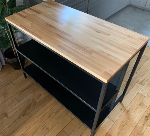 Wyspa kuchenna. Całość wykonana ręcznie. Stelaż stalowy malowany proszkowo na kolor czarny matowy. Elementy drewniane wykonane z drzewa bukowego zabezpieczone olejem naturalnym. (opcjonalnie możliwość zmiany rodzaju drewna na zamówienie po kontakcie ze sprzedającym)