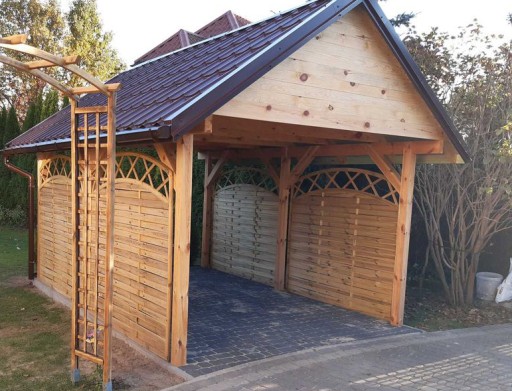 Oferujemy Państwu drewnianą konstrukcję wiaty garażowej o wymiarach zewnętrznych 460 x 360 cm.