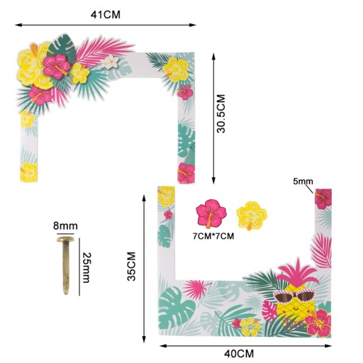 Opis Te ramki na zdjęcia są niesamowite! Może sprawić, że letnia impreza będzie bardziej świąteczna i szczęśliwa. Nasza duża ramka do selfie z nadrukiem w kwiaty i ananasy jest idealna, abyś mógł uwiecznić niezapomniane chwile z rodziną i kolegą z klasy, wszyscy pokochają zabawne rekwizyty imprezowe, pochwal się swoimi hawajskimi zdjęciami selfie ze znajomymi za pośrednictwem sieci społecznościowych, takich jak Instagram i Facebook .