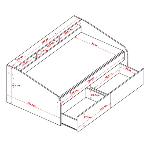 - Płyta meblowa - stabilna konstrukcja łóżka, które jest wykonane z wysokiej jakości płyty meblowej o grubości 18mm.