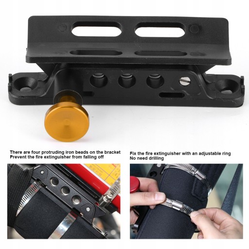Wspornik gaśnicy samochodowej jest bezpiecznie przymocowany do przedniej i tylnej części podłokietnika fotela za pomocą regulowanego pierścienia lub śruby są mocowane do punktu mocowania fotelika bez wiercenia.