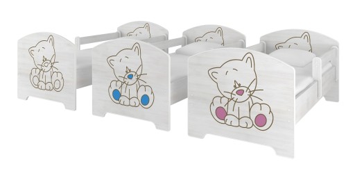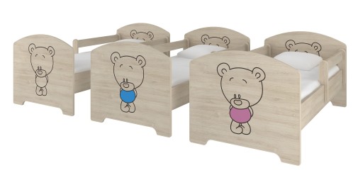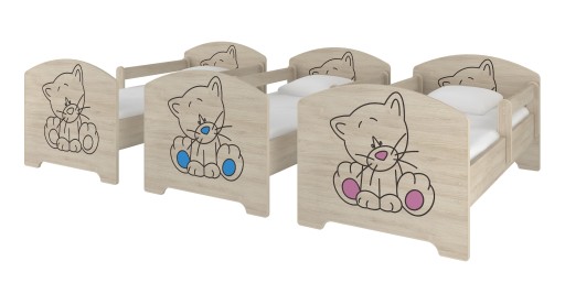 Łóżko wykonane jest z płyty wiórowej w kolorze wersje grawer to dąb sonoma lub surf biały wersja brązowa to płyta Venga a kolorowe grafiki połączone sa z płyta surf biały o grubości 16 mm, wykończonej miękką okleiną. Każdy element jest zaokrąglony, tak aby zapewnić dziecku maksymalne bezpieczeństwo, unikamy ostrych i niebezpiecznych krawędzi.