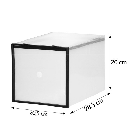 Pojemnik na obuwie został wyposażony w wysuwaną szufladę, które pozwoli na szybki dostęp do wybranych butów. Dodatkowo pudełko posiada specjalne zaczepy pozwalające na łączenie ze sobą pudełek umożliwiając tym samym ułożenie je na sobie. Używając organizera z zamknięciem buty zostaną ochronione przed kurzem oraz wilgocią.