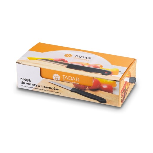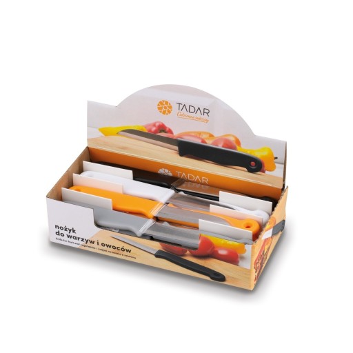 Zestaw noży kuchennych do warzyw i owoców Tadar Display 36 sztuk wykonano ze stali nierdzewnej i tworzywa sztucznego. Całość zapakowano w praktyczny kartonik. Jest to oferta mix kolorów. Rękojeści nożyków są w 4 różnych barwach – każdy wariant po tyle samo sztuk. Zamówisz więc zestaw aż 36 nożyków dobrej jakości do swojego sklepu. Jednorazowo zdobędziesz również dużo małych nożyków np. dla wszystkich uczestników warsztatów kulinarnych. Wykorzystasz je do sprawnego obierania lub krojenia warzyw oraz owoców. Nade wszystko wybierzesz model ostry, poręczny i w sam raz do domowej kuchni.