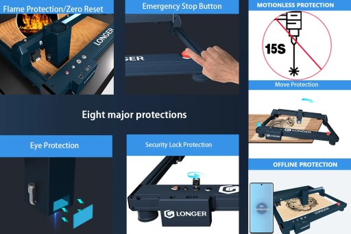 Laser B1 jest wyposażony w 8 głównych zabezpieczeń, w tym ruch, płomień, tryb offline, bez ruchu, blokadę bezpieczeństwa, ochronę oczu, przycisk zatrzymania awaryjnego i zerowanie. Laser wyłącza się automatycznie w przypadku upadku, płomienia, utraty danych lub zamrożenia głowicy lasera na ponad 15 sekund. Głowica lasera jest również automatycznie resetowana do zera, aby zapobiec wypaleniu podczas pożaru. Ponadto panoramiczny szklany filtr skutecznie filtruje 99,8% lasera, zapewniając bezpieczniejsze wrażenia użytkownika.