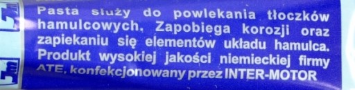ATE Bremszylinder - pasta/smar do napraw, montażu i konserwacji części układów hydraulicznych. Zapewnia kompleksową ochronę oraz maksymalną efektywność pracy podzespołów układu hamulcowego. Może być stosowana zarówno do smarowania ścianek cylinderków jak i powierzchni tłoczków w układach, które mają kontakt z płynami hamulcowymi klas DOT 3, DOT 4 i DOT 5.1.