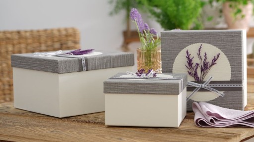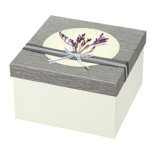 Urocze pudełko prezentowe w kolorach szarym i kremowym. Przykrywkę w ozdobnej okleinie przypominającej tkaninę, zdobi wstążka z kokardą i suszone gałązki. Wnętrze pudełka jest w kolorze brązowym.