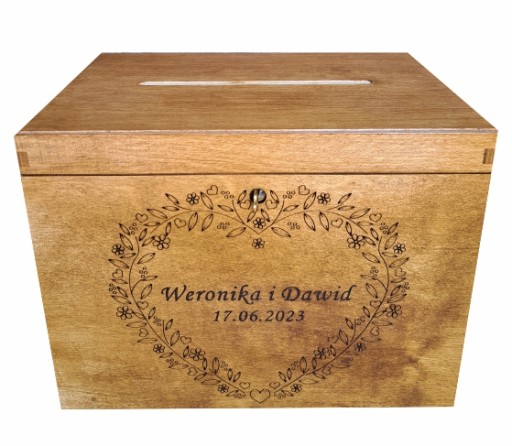 Kufer zamykany jest na złoty kluczyk i na pewno pomieści dużą ilość ślubnych kopert.