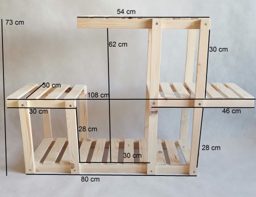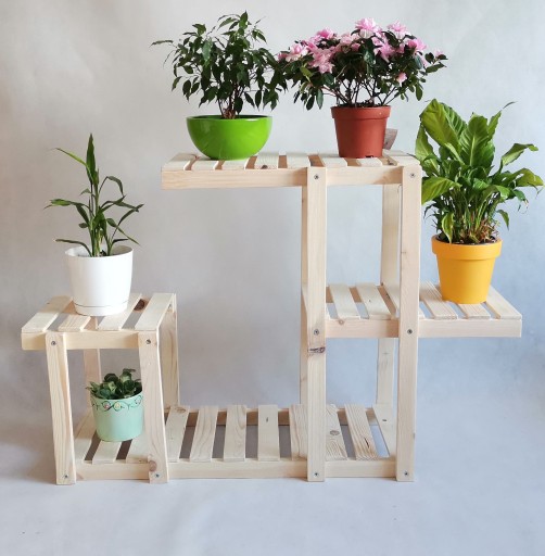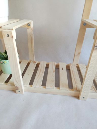 Naturalny sosnowy stojak na doniczki jak i ciężkie donice , konstrukcja sztywna z szlifowanego drewna z widocznym usękowieniem . Listwy głównej o grubości 4x2 cm .