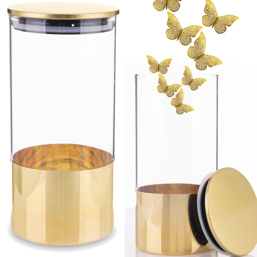 Pojemnik z szczelną pokrywką w kolorze transparentno - złotym, sprawdzi się jako doskonała skrytka na waciki, patyczki oraz płatki kosmetyczne także świetny jako dekoracja do pokoju, łazienki czy sypialni.