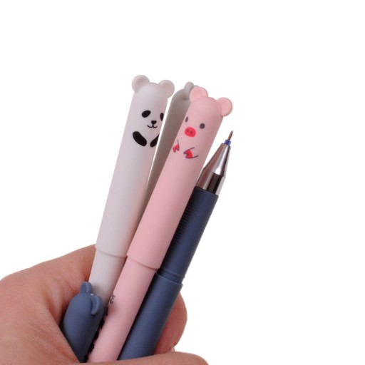 - Wszystkie długopisy piszą niebieskim tuszem, który można z łatwością wymazać dzięki gumce na odwrocie pisaka.