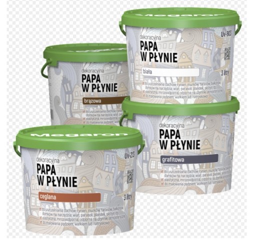 Dekoracyjna Papa w Płynie Megaron jest elastycznym materiałem powłokowym, służącym do zabezpieczania zewnętrznych powierzchni. Papę można zastosować zarówno w celu ochronnym, jak i dekoracyjnym. Pod względem chemicznym stanowi mieszankę surowców mineralnych, dyspersji polimerowej, chemicznych dodatków modyfikujących i wody, o konsystencji gęstej, jednorodnej. Elastyczność oraz wytrzymałość na kontakt z wodą zapewnia wysoką odporność powłoki bez względu na warunki atmosferyczne.