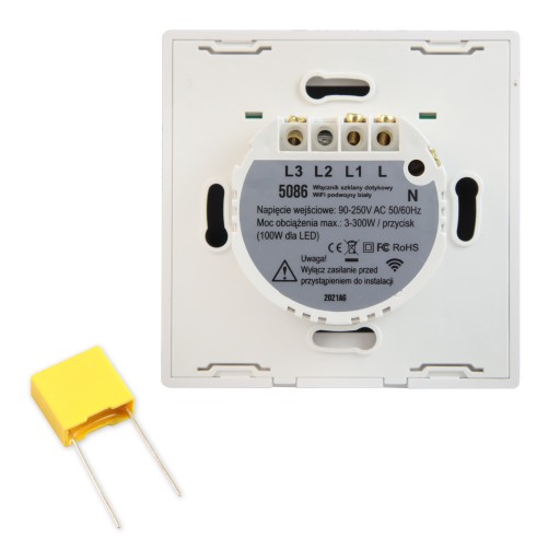 ⏺ Nasze włączniki wymagają podłączenia przewodu neutralnego (N). Dodatkowo do każdego wyłącznika w zestawie znajdą Państwo kondensator do LED (<3W) który jest wymagany przy małych źródłach światła (zapobiega miganiu)