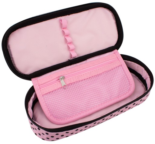 - Wewnątrz na klapce znajdują się gumowe uchwyty na przybory do pisania oraz skrzydło, na którym jest kieszonka z siateczki zamykana zamkiem błyskawicznym i kolejne gumowe uchwyty.