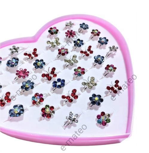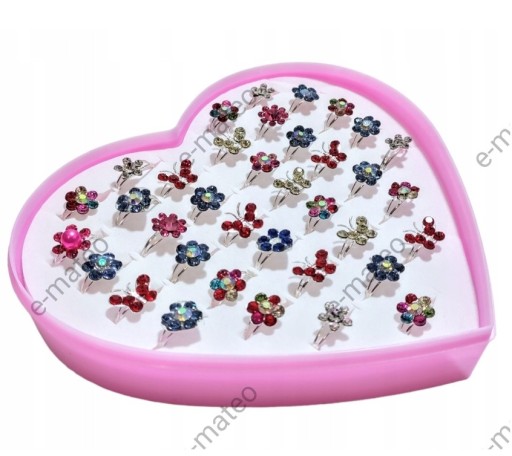 - 36 pierścionków z błyszczącymi elementami umieszczono w pudełeczku w kształcie serca.