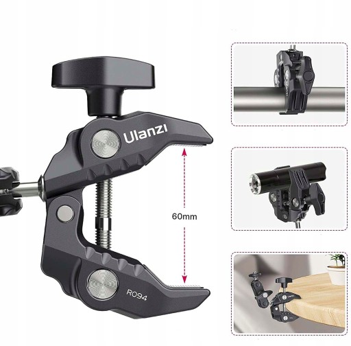 Zacisk daje nam bardzo dużo możliwości montażowych w studio i na zewnątrz. Motylkowy docisk jest regulowany i bardzo mocny dzięki czemu dopasujemy go do przedmiotów o różnej grubości np. blat biurka, płot, gałąź, rurka, kierownica, deskorolka itd.