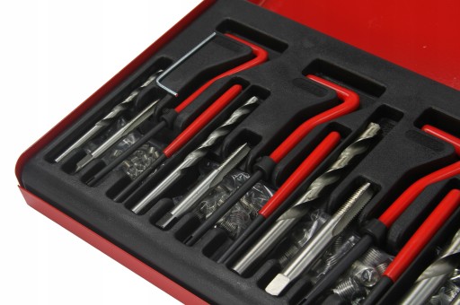 Zestaw do naprawy, regeneracji najbardziej popularnych gwintów. Wszystkie wiertła i gwintowniki wykonano z najlepszej jakości materiałów. Gwintowniki jednostopniowe idealnie nacinają gwint, w który wprowadza się wkładkę spiralną z twardej stali nierdzewnej. Całość w praktycznej walizce.