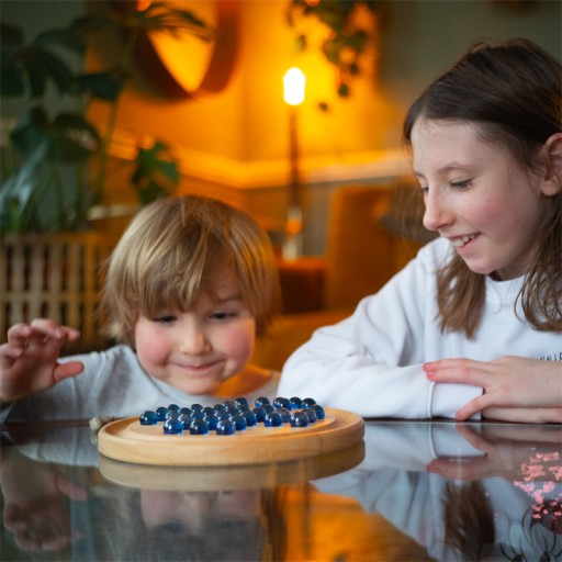 Ten drewniany zestaw pasjansa zawiera błyszczące kulki na eleganckiej, okrągłej drewnianej desce.
