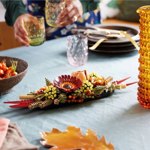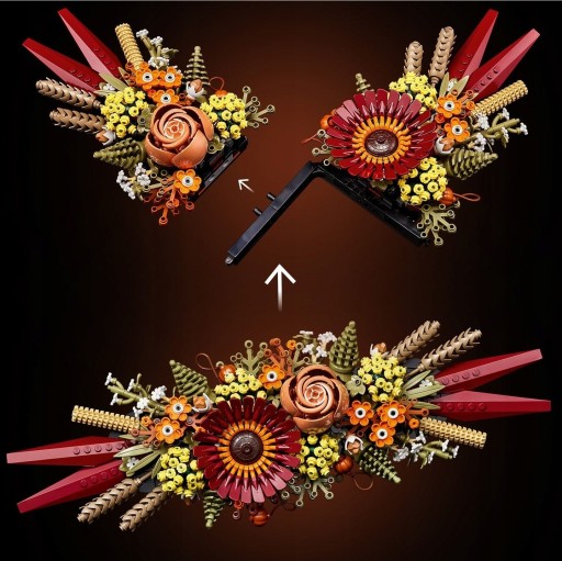 - Inspirowany jesienią - ten kwiatowy zestaw konstrukcyjny jest pełen kolorowych kwiatów inspirowanych barwami jesieni, a jego głównymi elementami są gerbera i róża