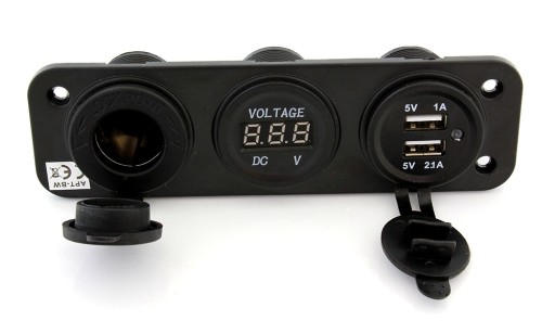 Montażowe gniazdo zapalniczki 12V z dwoma portami USB 5V oraz wbudowanym woltomierzem.