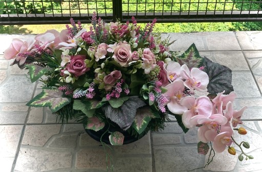 Przedmiotem sprzedaży jest śliczna wiązanka/stroik ze sztucznych kwiatów, w eleganckiej, obciążonej okrągłej misie.