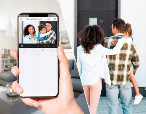 Będąc poza domem, możesz zarówno zobaczyć osoby stojące przed drzwiami wejściowymi, jak i rozmawiać z nimi przy użyciu smartfona z aplikacją EZVIZ.