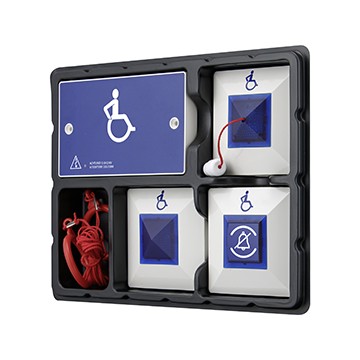 Zestaw urządzeń systemu przyzywowego do toalet wraz z dostępnymi akcesoriami to idealne rozwiązanie zapewniające zgodność budynków komercyjnych, w tym handlowych, restauracyjnych, biurowych i hotelowych ze standardem dostępności.