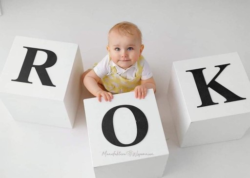 Trzy kostki tworzące napis "ROK". Kostki mają wielkość 30x30x30cm.