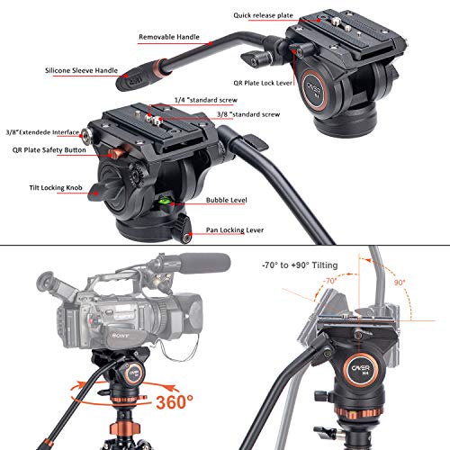 • 【Głowica uchylna do panowania】: Posiada stałą równowagę licznika, pochylanie i pochylenie z odłączaną listwą o stałej długości, oferuje panoramowanie 360° i pochylenie +90°/-70°; zintegrowana płaska podstawa z gwintem 3/8"-16