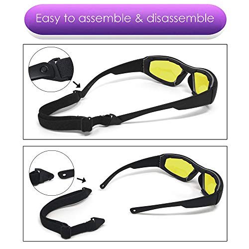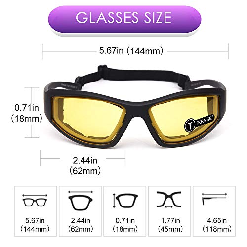 • ☀Wnętrze okularów jest wyposażone w wygodną piankową podkładkę, która dopasowuje się do twarzy, jest wiatroszczelna, pyłoszczelna i odporna na uderzenia oraz chroni przed aktywnością na świeżym powietrzu. Jest wyposażony w regulowaną torbę na okulary dla większego bezpieczeństwa.