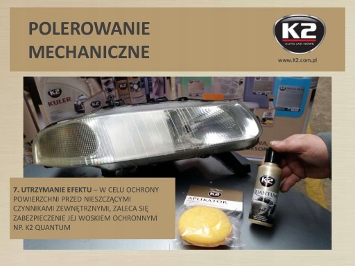 Doskonałym uzupełnieniem dla pasty K2 LAMP DOCTOR, jest powłoka zabezpieczająca reflektory K2 Lamp Protect, która chroni lampy przed matowieniem, żółknięciem, zarysowaniem oraz promieniami UV nawet przez rok od momentu nałożenia powłoki.