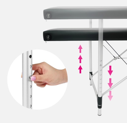 Wysokość można dostosować do wzrostu i indywidualnych potrzeb osoby wykonującej zabieg za pomocą regulacji z mechanizmem blokującym. Każda z aluminiowych nóg stolika składa się z dwóch rurek, które po odblokowaniu można swobodnie przesuwać względem siebie. Mechanizm Fast Lock utrzymuje elementy w wybranej pozycji po umieszczeniu blokady w odpowiednim otworze.