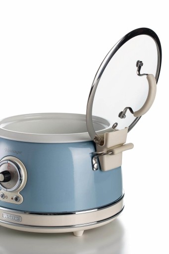 Wolnowar wielofunkcyjny z linii Vintage, moc 650 W, 5 funkcji (wolnowar, gotowanie ryżu, gotowanie na parze, patelnia, podgrzewanie/utrzymywanie temperatury do 24 h), wyjmowana żaroodporna misa z nieprzywierająca ceramiczną powłoką, koszyk do gotowania na parze, miarka, łyżka, uchwyt pokrywy, wydajność 1,8 l ryżu, poj. 3 l