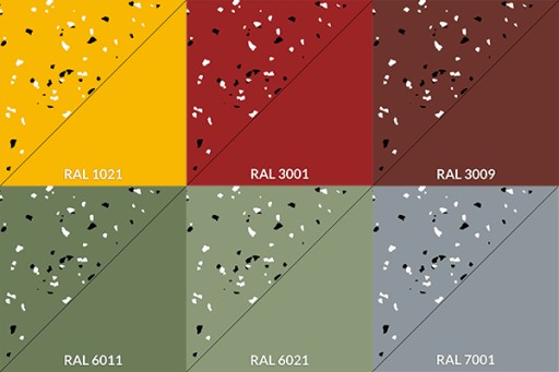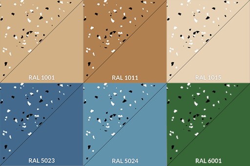 RAL: 1001, 1011, 3009, 6021, 7001, 7030, 7032, 7040, 7045, 7046, 7047, 1021,1015, 6001, 6011, 7035, 8017, 9003, 9005, 5024, 3001, 5023, 7024, 7038